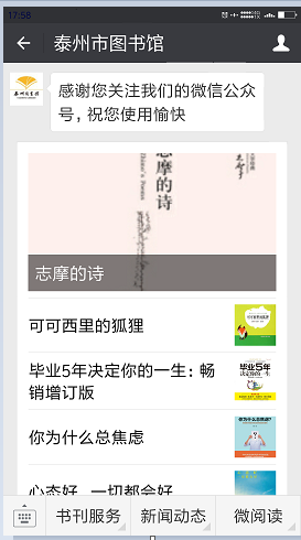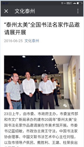(四)建设新媒体发布平台。2016年开通泰州“微阅读”和“文化泰州”公众微信号,泰州市文化馆、博物馆、海军诞生地纪念馆、美术馆在做好单位门户网站的基础上,也分别开通公众微信号,发布各类文化新闻资讯。协助市政府办完善了设在市图书馆的政务信息公开中心的建设。