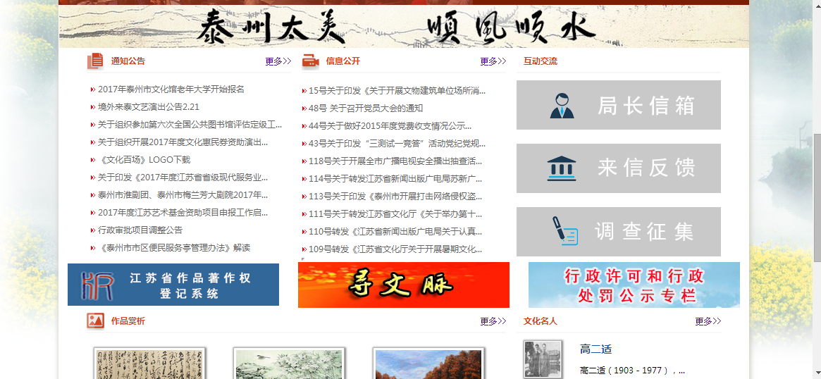 (二)公开公共文化资源信息。围绕社会热点组织“文化惠民”、“梅兰芳艺术节”、“作品赏析”、“寻文脉”等专题报道,主动介绍群众文化艺术节、全民阅读等重点文化工作进展情况,设计《关于泰州市全民阅读的调查问卷》和《关于泰州市基层文化建设情况的调查问卷》等与观众进行交流互动。进一步推进权力清单和责任清单公开,及时公示“行政许可和行政处罚”事项。