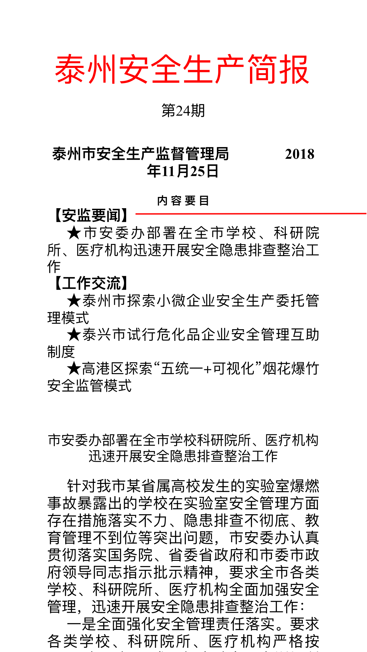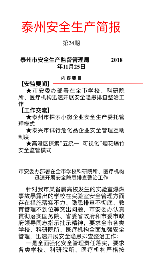 本年报是根据《中华人民共和国政府信息公开条例》(以下简称《条例》)和《泰州市政府信息公开规定》要求,由泰州市应急管理局编制的2018年度政府信息公开年度报告。全文包括工作概述,政府信息主动公开情况,依申请公开政府信息情况,政府信息公开的收费及减免情况,咨询情况、复议、诉讼和申诉的情况,存在的问题、改进措施和附表等七部分。本报告所列数据的统计期限自2018年1月1日起至2018年12月31日止。电子版可以在泰州市应急管理局网站(网址http://ajj.zwinkt.com/)“信息公开”栏目中进行查阅。如对本报告有任何疑问,请与泰州市应急管理局联系(联系地址:梅兰东路118-1号,邮编:225300,电话/传真:0523-86895005;电子邮箱:tzajfgc@sina.com)。