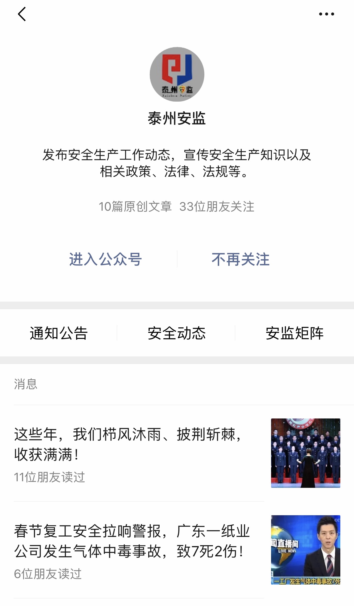 (二)丰富公开形式。充分发挥门户网站信息公开第一平台作用,加强局门户网站改版升级工作,规范政府信息公开专栏建设。强化网站信息内容保障,健全内容发布审核机制,强化互动和服务功能。在泰州电视台开设《聚焦安全》专栏,每周一期,重点播报全市安全生产新动态、新举措及相关工作进展情况,全年共播出62期。年底制作了1个安全生产纪录专题片,以电视节目、记录短片的形式更生动形象地向公众展示、公开安全生产工作,加大公开力度。利用“泰州安监”微信公众平台,发布各类有利于推进安全生产监管工作的信息,鼓励网民对安全生产工作多提意见和建议,征集掌握民情民意,服务群众,不断提高群众对政府部门的满意度。同时适时召开新闻发布会,举办“安监大讲堂”、“法治大讲堂”、“道德讲堂”等一系列活动。依托各类活动为载体向社会公开,让广大人民群众在了解安监工作的同时参与安监工作,促进我们更好地完成各项工作。