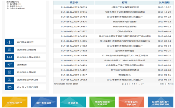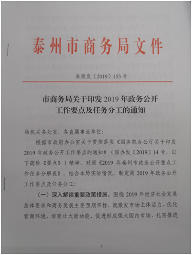 推进相关基础工作。贯彻落实《国务院办公厅关于印发2019年政务公开工作要点的通知》(国办发〔2019〕14号)精神,结合我局实际情况,第一时间制定发布《市商务局关于印发2019年政务公开工作要点及任务分工的通知》(泰商发〔2019〕153号)。机构改革后在局网站依法公开本局的“三定”规定等信息,及时更新主动公开基本目录、政府信息公开指南。按照规定格式、规定时间、规定网址将预算、决算公开到位,建立行政规章和规范性文件公开台账,确保公开的政府信息底数清晰。
